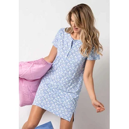 Dámská noční košilka značky Siélei v jemném a romantickém provedení je ideální volbou pro pohodlný spánek i domácí relax. Košilka má krátké rukávy a praktické zapínání na knoflíčky v oblasti výstřihu, které dodává modelu lehce klasický vzhled. Světle modrý podklad s drobným květinovým vzorem působí svěže a velmi žensky. Pohodlný střih se jemně přizpůsobí postavě a malé boční rozparky zajišťují volnost pohybu a příjemné nošení. Měkký a lehký materiál je příjemný na dotek a poskytuje maximální komfort během celé noci. Tato noční košilka Siélei je skvělou volbou pro ženy, které hledají kombinaci pohodlí, jednoduché elegance a kvalitního zpracování.
