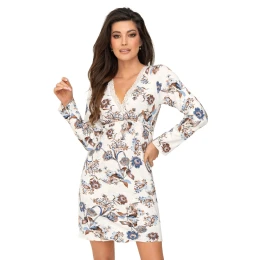 Dámska nočná košeľa Naomi Donna - krémová farba - vyrobená z kvalitnej viskózy - s dlhými rukávmi - výstrih do V zdobený čipkou - s kvetinovým vzorom - spodný lem ukončený volánomZloženie materiálu: 95% viskóza + 5% elastan