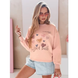 Táto dámska nadrozmerná mikina má rozkošnú potlač srdiečok a nápisov, ktoré jej dodávajú charakter. Univerzálna veľkosť je vhodná pre veľkosti XS až L. Dizajn bol obohatený o jemnú výšivku, ktorá vytvára rozmerný efekt. Model má okrúhly výstrih a pohodlné rebrovanie na rukávoch a spodnom okraji, vďaka ktorému sa dokonale prispôsobí postave. Vďaka mäkkému materiálu je mikina ideálna na jar.