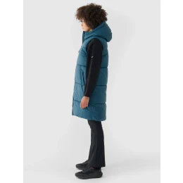 Dámska dlhá páperová vesta má integrovanú kapucňu s možnosťou nastavenia objemu. Krk je krytý vysokým golierom, ktorý ďalej chráni pred chladom a vetrom.