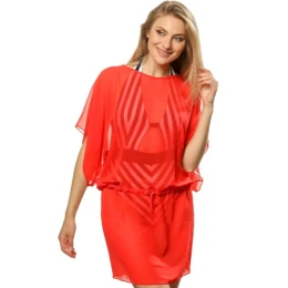 Dámska plážová tunika od značky Jolidon v červenej farbe. Plážová tunika sa oblieka cez hlavu a má voľné prestrihy na ruke. Je voľná, ale v páse má všitú šnúrku, vďaka ktorej si zvolíte vzhľad tejto tuniky. Dĺžka je po kolená. Je ľahká a jemná.