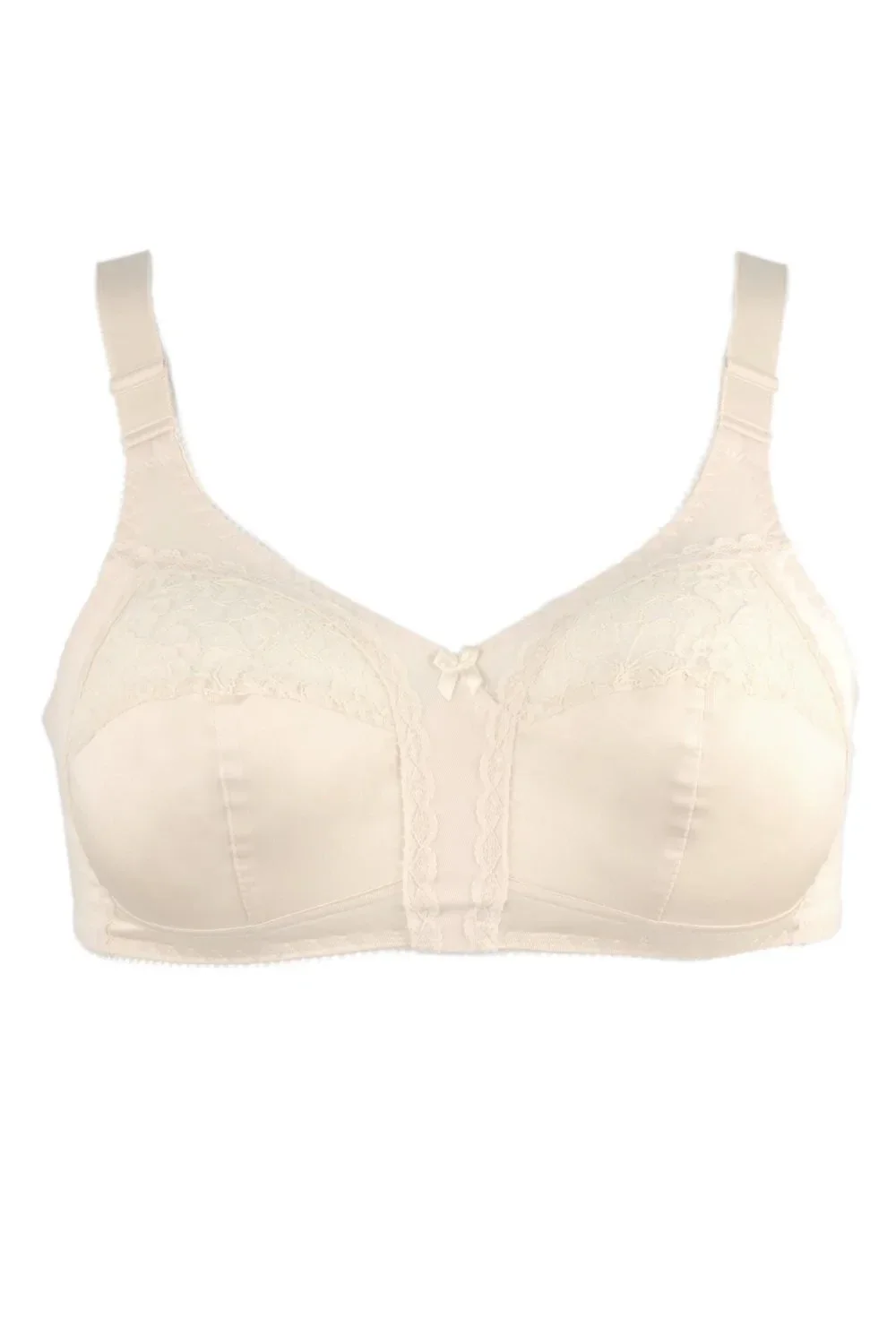 Dámska podprsenka 577 Joanna beige plus VIKI - béžová farba - hrubšie ramienka - nevystužené košíčky s kosticami - netradičný strih - košíčky sú zdobené jemnou čipkou - medzi košíčkami jemná mašlička na ozdobu Zloženie materiálu: 78% polyamid +18% elastan + 4% bavlna