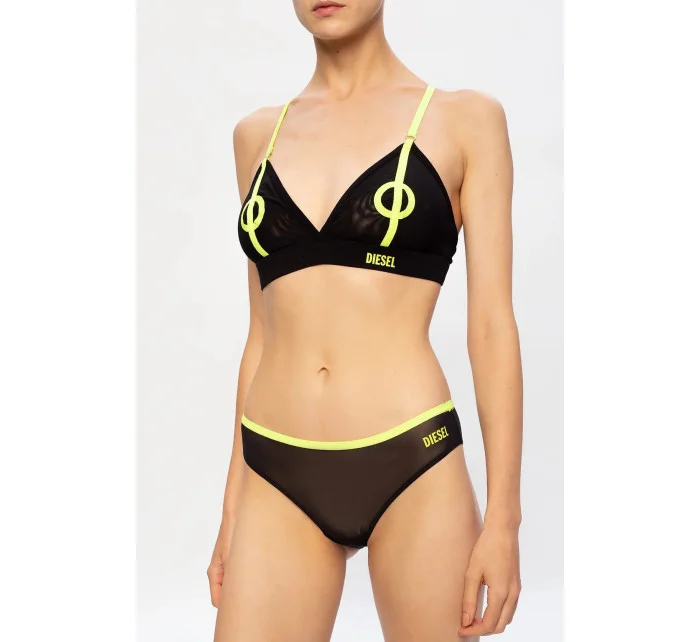 Čierno zelená podprsenka značky Diesel. Tento model je vyrobený z polopriehľadné strečové textílie a má vyšívané ramenné popruhy s logom, ramienka sú výškovo nastaviteľné.