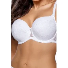 Biela vystužená podprsenka. Vrchná časť košíčkov je hladká, na spodnej časti je našitá kPunčochové nohavice. Stredom košíčkov vedie drobný volánik. Model má bočné kostice a neodopínacie ramienka. Košíčky sú zvnútra pošité bavlnou. Do Súpravau je možné dokúpiť tangá aj nohavičky.: