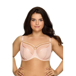 Košíčky jsou vyrobené ze stabilního tylu podšitého ve spodní části materiálem. Košíčky ideálně obepínají a tvarují poprsí. Pružný a transparentní obvod je zpevněný bočními kosticemi. Obvod stabilizuje podprsenku a udržuje ji na správném místě. Ramínka, která jsou přizpůsobená velikosti a rozměru ulehčují zádům. Celému modelu dodávají na půvabu saténové pásky obšité multibarevnou lesklou přízí a pásky na kovových multibarevných kolečích, které zdobí dekolt.