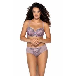 Podprsenka má střih a konstrukci typu K-1030. Model AV 1985 spojuje krásu s pohodlím. Tato podprsenka nejenom zdobí vaše poprsí, také o něj dbá, nadnáší jej a stabilizuje. Spodní část polovyztužených košíčků je vystlaná měkkou pěnou a je pokrytá potištěným tylem v odstínech růžové a šedé barvy. Vrchní část košíčků tvoří stabilní tyl s krásnou výšivkouu s lesklou přízí. Celý model v růžovo-vřesovém barevném provedení zdobí stříbrný lesk a netypická mašlička s přívěskem s černým očkem.