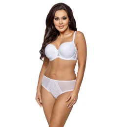 Bílá vyztužená podprsenka. Vrchní část košíčků je hladká, na spodní části je našitá kPunčochové kalhotya. Středem košíčků vede drobný volánek. Model má boční kostice a neodepínací ramínka. Košíčky jsou zevnitř pošité bavlnou. Do Soupravau lze dokoupit tanga i kalhotky.