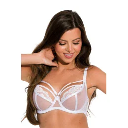 Miseczki w dolnej części wykonane z podwójnego tiulu. Warstwa zewnętrzna w kolorze białym, wewnętrzna ma kolor beżowy. Przeszycia przykryte białymi taśmami. Górna linia miseczek ozdobiona koronką, dodatkowo dekolt zdobią białe paseczki z regulacją.