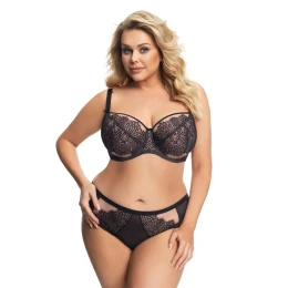 Podprsenka je vhodná pro ženy se středně velkým, velkým a velmi velkým poprsím. Model má módní vzhled, je pohodlný, svůdný a pěkně doplní vaše oblečení. Moderní a netypické provedení, spojení materiálů a ověřná konstrukce vytváří propracovanou podprsenku. Košíčky jsou vyrobené ze dvouvrstvého stabilního tylu a z jemné krajky. Košíčky jsou vytvarované drátkem a dokonale nadnáší poprsí a poskytují mu oporu. Model zdobí stabilní a elegantní černá krajka. Vrchní okraj modelu je olemovaný jemnou pružnou páskou. Můstek je ušitý z tylu a krajky. Boky modelu tvoří lycra s vysokou gramáží. Podprsenka má ve všech velikostech a rozměrech svislé boční kostice, a proto dokonale přiléhá k tělu. Model dokonale stahuje poprsí ke středu hrudníku, nadnáší jej a dodává mu pěkný oblý tvar.