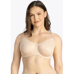 Dámska bezšvová podprsenka s kosticami od americkej značky PARFAIT. Táto podprsenka má nevystužené košíčky strihané z jednej časti, vo vnútri sú všité elastické pásiky pre podporu pŕs. Vonkajšia časť košíčka je pošitá jemnou čipkou. Podprsenka má vyšší stred, kostice a pružnú a výborne spracovanú dekoltovú časť a obvod dostatočne pevný a pritom pružný, čo sú atribúty, ktoré z nej tvoria veľmi dobre fungujúci celodenný model. Ramienka vychádzajú z dekoltovej časti, sú nastaviteľné a pevne všité. Dizajn je vo farbe cameo rose, veľmi decentný a jemný, kombinácia s geometrickou čipkou pôsobí elegantnú ozdobnosť. Materiálové zloženie: 85% polyamid 15% elastan