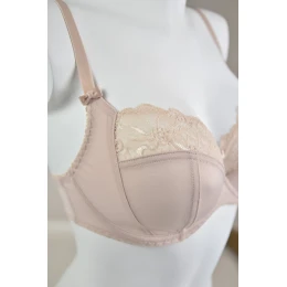 Měkká podprsenka, jejíž design je obohacen o boční část, která dokonale shromažďuje prsa k sobě. Spodní miska ze stabilního hladkého úpletu. Górnary mísa z krajky lemované tylem. Boční strany ze silného úpletu. Svislé boční velrybí kosti. Popruhy jsou nastavitelné, nelze je odepnout.