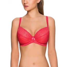 Push up podprsenka v koralovej farbe s jemne zdobenými ramienkami. Popruhy sú nastaviteľné, ale nie odnímateľné. Ideálne na jarné a letné dni. Košíčky potiahnite jemnou čipkou. Uprostred podprsenky je mašľa. Zadná časť podprsenky je priehľadná, vyrobená z koralovej čipky.
