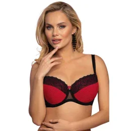 Elegantná podprsenka s kosticami z červeného úpletu s jemnou potlačou čiernych bodiek a pekným čiernym čipkovým lemom. Sieťovaný mostík, mašlička medzi košíčkami s visačkou, nastaviteľné, odopínateľné ramienka. Zadná časť z elastickej sieťoviny, zapínanie na háčik a očko.