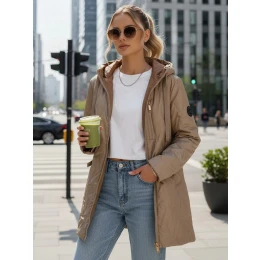 Kurtka damska przejściowa z kapturem sprawdza się przy zmiennej pogodzie i podczas codziennych wyjść. Pikowana konstrukcja pomaga utrzymać komfort termiczny, a zamek na całej długości ułatwia szybkie zakładanie. Dłuższy krój osłania sylwetkę i dobrze łączy się z casualowymi stylizacjami. Kieszenie pozwalają wygodnie schować drobiazgi.