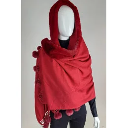 Krásna veľká šatka s priloženým golierom z umelej kožušiny a bambuľou. Mimoriadne mäkká a na dotyk príjemná tkanina pripomínajúca kašmír