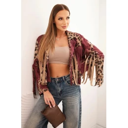 Dámska semišová bunda so strapcami s leopardím vzorom vo vínovej farbe