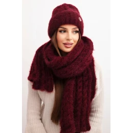 Dámska súprava čiapky a šálu s pruhom a ozdobou bordová