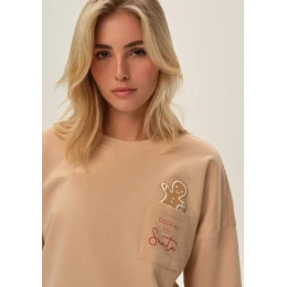 Dámská tepláková souprava od značky Henderson. Souprava je vyrobena z měkké hladké bavlny a zevnitř je zateplená. Mikina má dlouhé rukávy zakončené úplety, kulatý výstřih a je zdobená kapsou s vánočním motivem. Tepláky jsou dlouhé, mají kapsy na bocích a jsou zakončeny úplety.