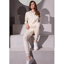 Dámský komplet značky Lormar v elegantním světlém odstínu je ideální volbou pro pohodlné domácí nošení i volnočasové aktivity. Mikina má zapínání na zip po celé délce, límeček u krku a dlouhé rukávy zakončené pružným lemem, přičemž límec i lemování jsou zdobené třpytivým stříbrným detailem, který dodává modelu luxusní a moderní vzhled. Kalhoty mají pohodlný střih s elastickým pasem a zakončením nohavic do pružného lemu, díky čemuž perfektně sedí a přizpůsobí se postavě. Materiál je velmi jemný, lehký a příjemný na dotek, takže zajišťuje maximální komfort po celý den.