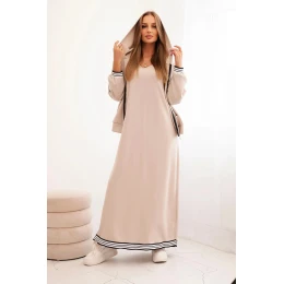 Pohodlná a módna dámska súprava z viskózy, ktorá sa skladá z dlhých šiat a krátkej mikiny s kapucňou a zipsom. Šaty majú jednoduchý strih s jemne rozšíreným lemom, vďaka ktorému sa dokonale prispôsobia postave. Mikina s praktickými vreckami a kontrastnými nášivkami dodáva súprave športový charakter a pôsobí moderne a uvoľnene.
