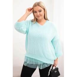 Dámská souprava svetr s výstřihem do V a viskózová blůza s krajkovým lemem mátová