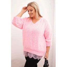 Dámsky sveter s výstrihom do V a viskózová blúzka s čipkovaným lemom candy pink