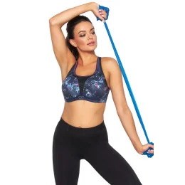 Odpružená konštrukcia založená na podpornej kostnej štruktúre sa osvedčí aj v extrémnych podmienkach. Košíčky sú vyplnené tenkou, mäkkou penou a podšité sieťovinou odvádzajúcou vlhkosť, čo maximalizuje funkčnosť a pohodlie podprsenky. Široké popruhy s otvorom na chrbte sú vystlané mäkkou penou a chrbát je vystužený stabilnou recyklovanou tkaninou. Všetky výstužné pásy sú ukryté vo vnútri, čo dodáva podprsenke estetickejší vzhľad. Dizajn je v pokojnom odtieni námorníckej modrej, posiaty ženskými farbami a výstrih je ešte zvýraznený fuksiovým lamé.