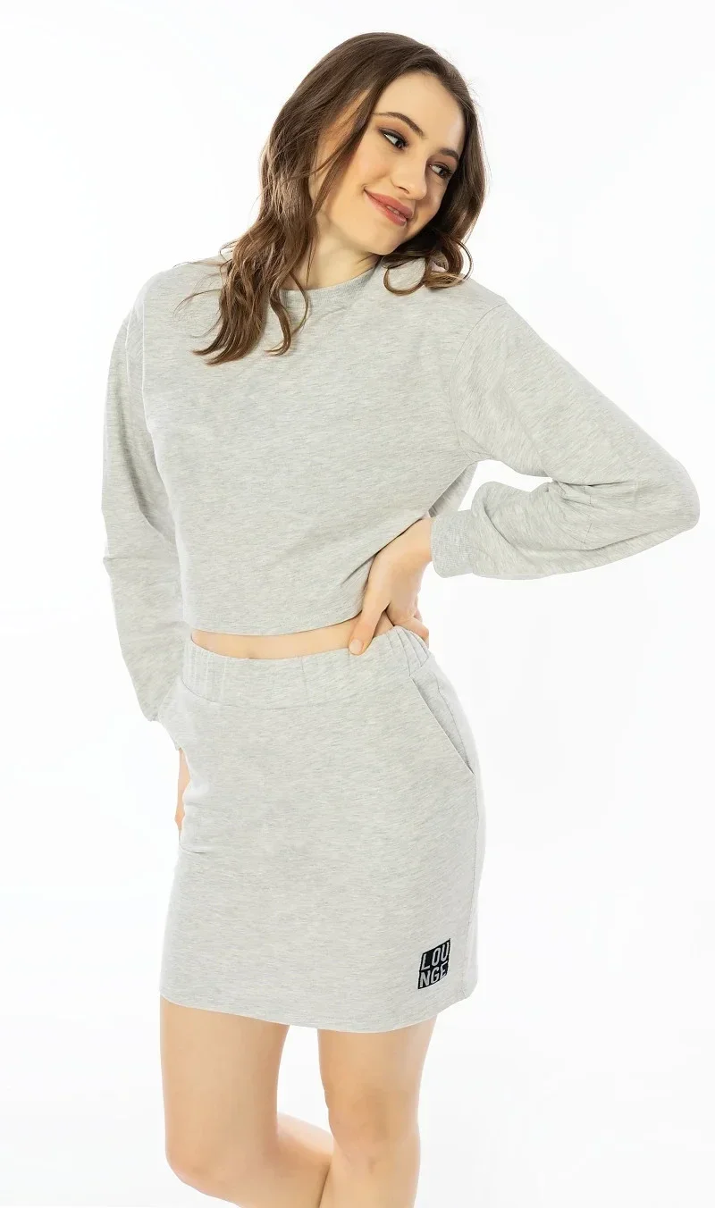 Dámska súprava Denisa. Súprava sa skladá z trička s dlhým rukávom a sukne. Tričko má okrúhly výstrih, rukávy so závesmi a modernú skrátenú dĺžku. Sukňa má praktické vrecká a elastický pás. Súprava je jednofarebná a sukňa má čiernu nášivku Lounge. Použitý materiál z vysokogramážnej bavlny je príjemný a pružný na dotyk. Súprava je pohodlná a možno ju použiť takmer na všetky voľnočasové aktivity.