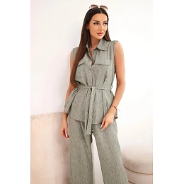 Táto štýlová dámska súprava je vynikajúcou ponukou pre ženy, ktoré oceňujú pohodlie, módny vzhľad a všestranné riešenia pri každodennom stylingu. Model pozostáva z blúzky bez rukávov so zapínaním na gombíky a dlhých nohavíc so širokými nohavicami, vďaka čomu je celý vzhľad ľahký, ženský a veľmi moderný. Ďalším plusom blúzky je klasický golier, náprsné vrecká a pás, ktorý krásne zvýrazňuje postavu. Nohavice majú pohodlný elastický pás, ktorý zaručuje komfort nosenia a dobré prispôsobenie sa postave.
