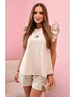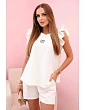 Tento štýlový dámsky komplet je ideálny na teplé dni! Skladá sa z ľahkej blúzky s roztomilými volánikmi na ramenách a priliehavých šortiek s pohodlným elastickým pásom. Blúzka má klasický, jednoduchý strih s okrúhlym výstrihom a ozdobnou aplikáciou, ktorá celému kompletu dodáva módny charakter. Šortky s voľnými nohavicami zaručujú voľnosť pohybu a pohodlie počas celého dňa. Tento komplet je skvelou voľbou na letné prechádzky, stretnutia s priateľmi alebo dovolenkové výlety. Vďaka univerzálnemu strihu a módnemu dizajnu ho môžete ľahko kombinovať so športovými teniskami, sandálmi alebo espadrilkami. Veľkosť je univerzálna a hodí sa pre ženy veľkosti S, M alebo L.