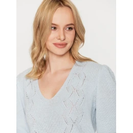 Krásný pudrově modrý dámský svetr s výstřihem do V značky Bellana Vegan&Ethical. Jemné puff rukávy tohoto svetru dodávají elegantní vintage atmosféru a hluboký výstřih ho udržuje moderní a svěží.