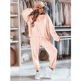 Komplet dresowy damski oversize, który łączy komfort i styl. Uniwersalny rozmiar pasuje na XS do XL. Bluza wkładana przez głowę, z ozdobną naszywką na rękawie i dłuższym tyłem, bez kaptura oraz ze ściągaczami przy rękawach. Spodnie z elastycznym pasem wiązanym na sznurek, zakończone ściągaczami przy nogawkach dla idealnego dopasowania. Dwie ozdobne kieszenie zapewniają w spodniach praktyczność. Idealny wybór na co dzień i do sportowych stylizacji.
