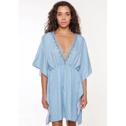 Dámska tunika od LingaDore. Tunika je vhodná na pláž alebo k bazénu a dokonale ladí s plavkami. Tunika je vzdušná, má voľné rukávy a "pruhovaný vzor". Pás je vyrobený z ľahkej gumy, a tak vytvára pekný tvar postavy. Po celej dĺžke výstrihu sú našité rôzne vzory malých korálok. Tunika je nad kolená.