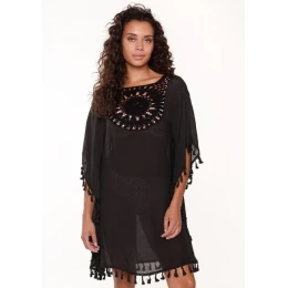 Dámska plážová tunika LingaDore. Tunika je vyrobená z ľahkého viskózového materiálu a je vhodná na horúce letné dni ako vrchný diel plaviek. Je polopriehľadná, s dĺžkou po kolená. Tunika má okrúhly výstrih s háčkovaným ornamentom. Na bokoch sú prieramky na vytvorenie voľných rukávov. Tunika je po celom obvode lemovaná prešívaním s malými strapcami. Materiálové zloženie: 100 % viskóza.