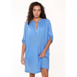 Dámska tunika od LingaDore. Tunika je polopriehľadná, vhodná na pláž aj k bazénu. Materiál je veľmi priedušný, vyrobený zo 100 % bavlny. Voľná tunika má 3/4 rukávy s možnosťou vyhrnutia a zapínania na gombík. Tunika má dĺžku po kolená a véčkový výstrih s prešívaným lemom. Na prednej strane sú po stranách našité vrecká.