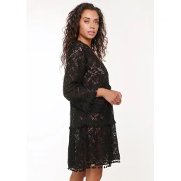 Dámská tunika značky LingaDore. Tunika má 7/8 rukáv, který je ukončený třásněmi. Třásně jsou našité v kaskádách po obvodu tuniky. Tunika je volná, celokrajková, vhodná na plavky na pláž nebo k bazénu. Má velký výstřih do "V", na kterém jsou našité šňůrky s třásněmi pro stahnutí mezi prsy. Tunika je delší nad kolena, spodní okraj zdobí malé bambulky.