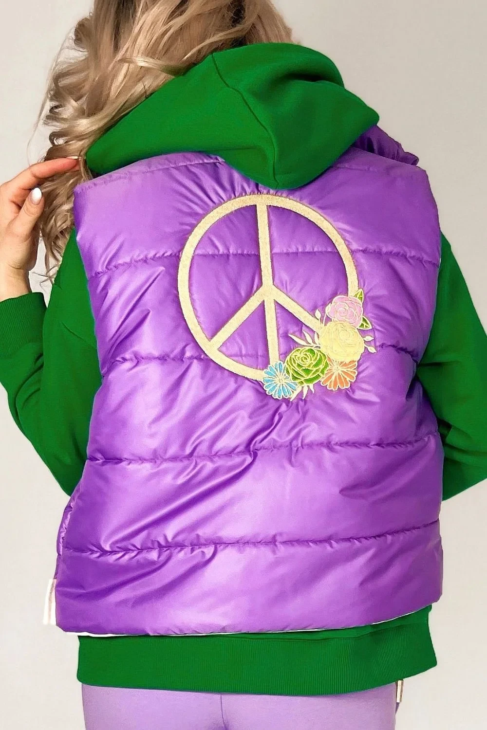 Dámská vesta Joy MM Fashion - bez rukávů - na zadní straně vyšitý znak Hippie - zapínání na zips - modelka měří 164 cmMateriálové složení: 100% polyester
