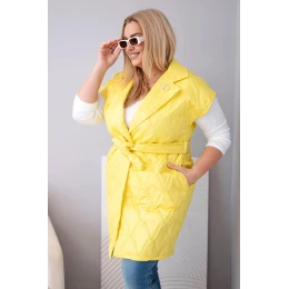 Stylová, prošívaná dámská vesta s páskem je nabídkou pro ženy, které si cení eleganci spojenou s pohodlím. Model s klasickým límcem a dekorativní broží „D” krásně zvýrazňuje siluetu díky přiloženému pásku, který lze regulovat v pase. Prošívaný materiál s geometrickým vzorem dodává celku moderní charakter a délka po kolena zajišťuje ochranu a komfort v chladnějších dnech.