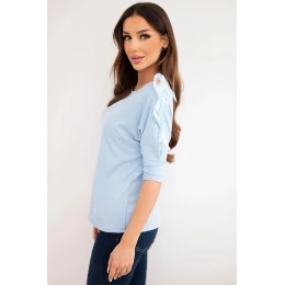 Táto dámska blúzka s 3/4 rukávmi a ozdobnými stuhami na ramenách je ideálnou voľbou pre ženy, ktoré majú rady jemné, ale efektné detaily. Je vyrobená z mäkkého, elastického úpletu na báze viskózy, ktorý zaručuje pohodlné nosenie a skvelú siluetu.