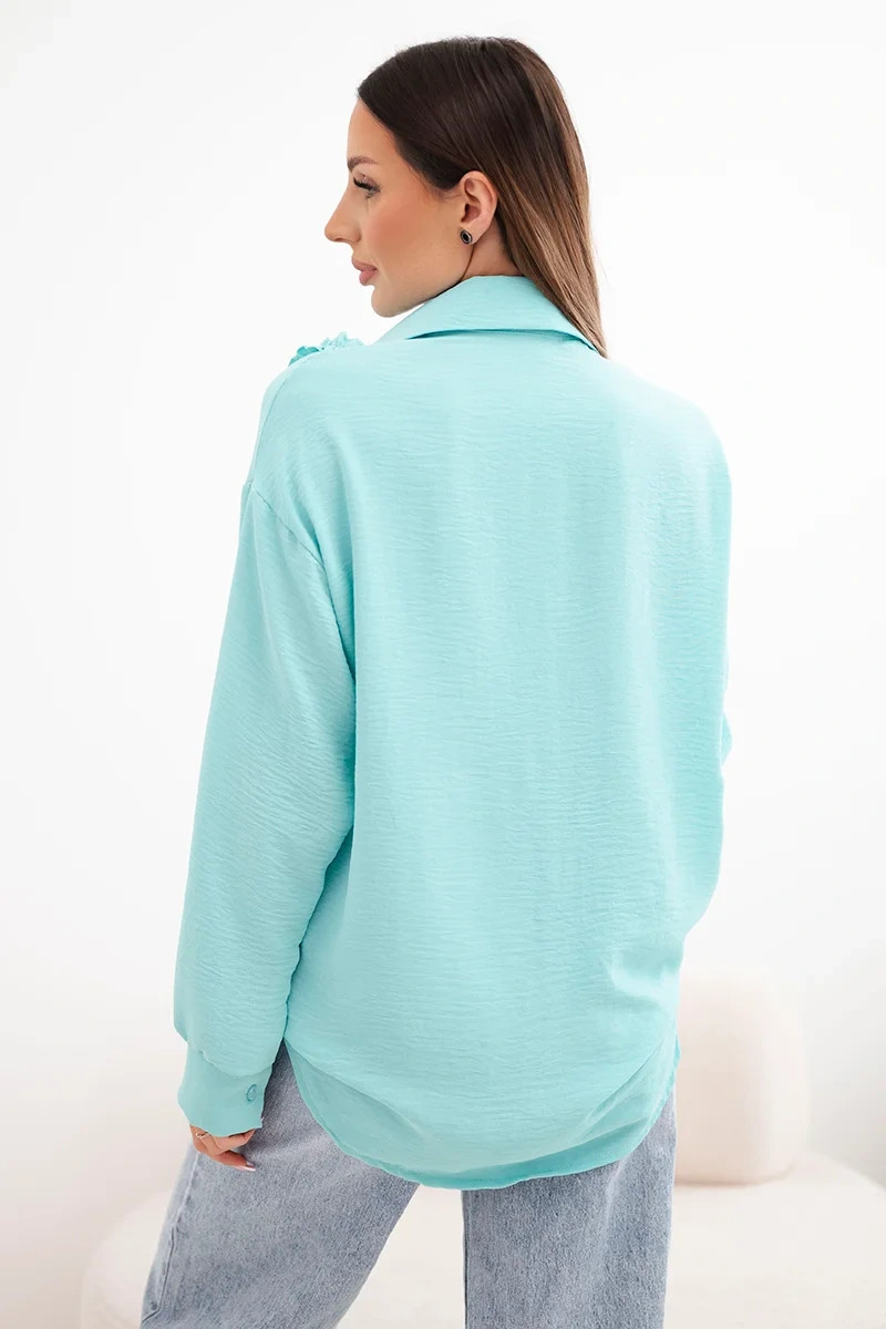 Dámsku košeľu dopĺňajú ozdobné volány po celej prednej strane, ktoré jej dodávajú jemnú ľahkosť a ženský šarm. Dlhé rukávy zakončené manžetou podčiarkujú elegantný štýl modelu a voľnejší strih zaručuje pohodlie počas celého dňa. Je ideálnou voľbou do práce, na obchodné stretnutia a na bežné nosenie s džínsami alebo elegantnými nohavicami.