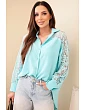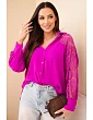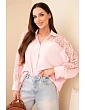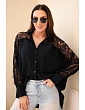 Táto štýlová dámska košeľa s elegantným golierom a jemným zapínaním na gombíky je ideálnou voľbou pre ženy, ktoré oceňujú triedu a pohodlie v každodennom štýle. Model má efektné čipkované rukávy a ramená, ktoré celku dodávajú výnimočný charakter. Voľný strih zaručuje voľnosť pohybu a pohodlie pri celodennom nosení.