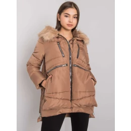 Dámska zimná bunda ťavej farby s kapucňou.