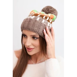 Dámska zimná čiapka s vlnou a nápisom s veľkou bambulou K422 cappuccino