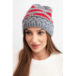 Dámska zimná čiapka z vlny v hrubom úplete a pruhoch K465 sivá + červená