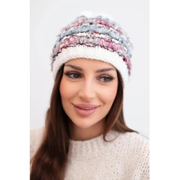 Dámska zimná čiapka s farebným vláknom a elastickou šnúrkou K352 biela+modrá+tmavoružová