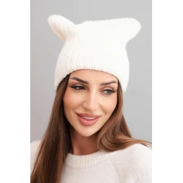 Dámska zimná vlnená čiapka v mačacom strihu z rebrovanej pleteniny K419 ecru