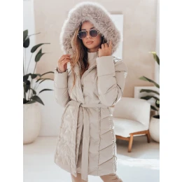 Długa pikowana kurtka zimowa z paskiem podkreślającym talię i kapturem obszytym miękkim futerkiem. Zapewnia skuteczną ochronę przed zimnem i wiatrem, a jednocześnie wygląda stylowo i kobieco. Idealna na chłodniejsze dni, zarówno do miejskich, jak i casualowych stylizacji.