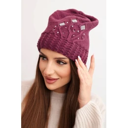 Dámska zimná čiapka s vlnou zdobená flitrami a pletením K473 tmavo fialová
