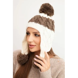 Dámska zimná vlnená čiapka s bambuľkami a ušnými klapkami K447 ecru + mocca