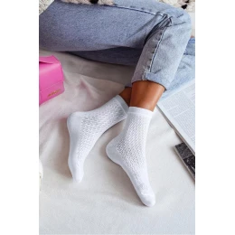 Biele dámske azúrové ponožky sú mäkké, pohodlné a ideálne na každodenné nosenie. Ľahký a priedušný vzor dodáva ponožkám elegantný vzhľad a príjemný pocit na nohe. Jednofarebný dizajn je nadčasový a ľahko sa kombinuje s rôznymi topánkami a oblečením.